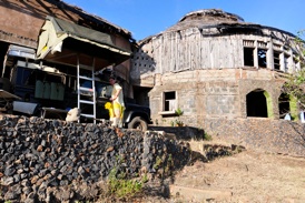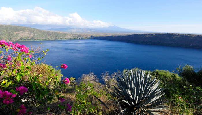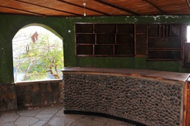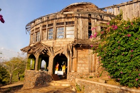 Wir zollen dem Kilimanjaro Respekt in dem wir ihn fast umrunden. Diese Tour an seiner östlichen Flanke entlang trägt uns vorbei am Lake Chala, einem Vulkankratersee. Man möchte meinen, dass ausgestattet mit GPS und „tracks for africa“ jede Route zu finden ist, aber diesmal scheinen wir uns tatsächlich eines der abgelegeneren Ziele herausgesucht zu haben. Jedenfalls stehen wir am Fuße des Vulkankegels etwas ratlos zwischen Dornbüschen und suchen nach dem Weg hinauf. Stefan schickt mich zur Fußpirsch (wer nicht fahren will muss fühlen) und ich nehme tatsächlich die Fährte auf. Steffen fährt voraus, sehr zu meiner Beruhigung, denn bei diesem holprigen Gelände aus Felsgestein weiss man nie genau, was einen um die nächste Biegung erwartet. Aber wir reden hier über zwei Land Rover. Ehrensache, dass sie sich gemeinschaftlich bergan schaukeln, um kurz darauf auf dem Kraterrand zu surfen, wie zwei Holzkähne auf hoher See. An höchster Stelle des Kraterrandes entdecken wir tatsächlich die Lodge, von der in unserem Reiseführer die Rede ist. Allerdings scheint diese inzwischen verlassen. Lediglich drei Einheimische „Indianer“ (O-Ton Steffen) huschen verschreckt hinter die maroden Fensterläden, als sie uns bemerken. Als wir das Objekt näher in Augenschein nehmen, bleibt uns fast der Atem stehen. Die Lodge hat einen traumhaften Ausblick über den gesamten Kratersee. Der Garten quillt über vor mediterran anmutender Blütenpracht. Die Lodge selbst muss einmal sehr herrschaftlich und edel gewesen sein. Die einstige Bar (heute zum Leidwesen unserer Männer leergetrunken) steht noch in voller Schönheit da, mit Rundbögen die den freien Blick auf die Landschaft zulassen. Bereits jetzt ist es beschlossene Sache, wir werden heute dort ein opulentes Mal kochen und der untergehenden Sonne dabei zusehen wie sie sachte in den See gleitet. Die drei Einheimischen trauen sich nun aus ihrem Versteck und erzählen uns, dass die Lodge schon seit dem Jahr 2000 nicht mehr bewirtschaftet ist. Wir wundern uns darüber, denn dafür ist die Anlage noch in gutem Zustand und sehr sauber. Nach kurzer Diskussion kommen wir zu dem Schluss, dass das Dreigestirn wahrscheinlich dafür entlohnt wird, alles notdürftig zusammenzuhalten. Da manche Bungalows nie fertig-gestellt wurden, nehmen wir an, dass dem Besitzer schlicht das Geld ausging. Wahrscheinlich hofft er darauf, irgendwann verkaufen oder wieder neu eröffnen zu können. In der Zwischenzeit hängen im Speisesaal die Fledermäuse von der Decke und durch die Mahagoni-Balken pfeift der raue Wind des Kratersees. Wir Vier machen es uns gemütlich und dinieren ganz nach unserem Vorsatz in der Bar auf weissen Tischdecken (wozu ein altes Bettlaken nicht alles gut ist) und tauschen Reiseanekdoten aus, bis die Nacht herein-bricht.